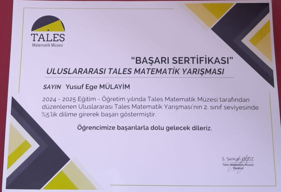 Yalova Uzmanlar Koleji İlkokulu 2. sınıf öğrencisi Yusuf Ege Mülayim, 2024-2025 eğitim-öğretim yılında düzenlenen Uluslararası Tales Matematik Yarışması’nda gösterdiği üstün performansla Türkiye genelindeki öğrenciler arasında %5’lik başarı dilimine girmeyi başardı. Küçük yaşına rağmen büyük bir başarıya imza atan Yusuf Ege, ailesi, öğretmenleri ve okul yönetimi başta olmak üzere tüm Yalova’nın gururu oldu.